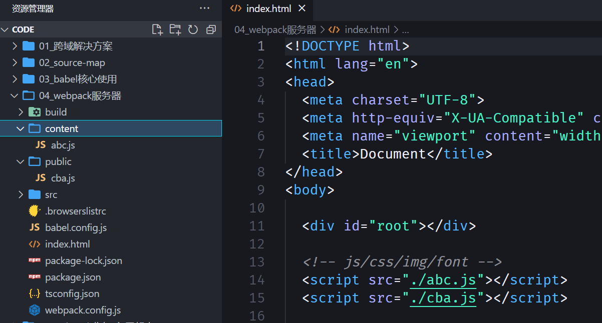 比如在 index.html 中,我们需要依赖一个 abc.js 文件,这个文件我们存放在 public 文件 中;