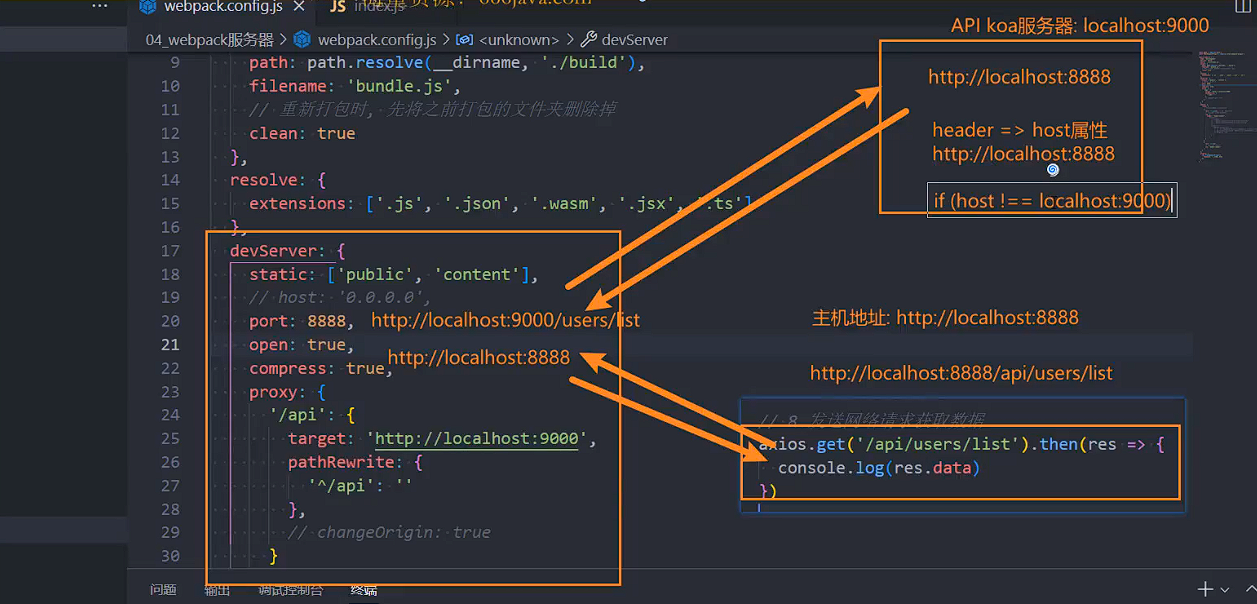 };发送/api/users/list 这个请求本质上访问的是http://localhost:8888//users/list,然后将这个请求发送给代理服务器 devServer,devServer 再发送给 koa 服务器,koa 服务器 header 中的 host 属性是http://localhost:8888,但是因为服务器的地址是http://localhost:9000,如果服务器有判断 host 不是 localhost:9000 就不返回数据(防止数据被爬),那么接口访问就不能拿到数据。