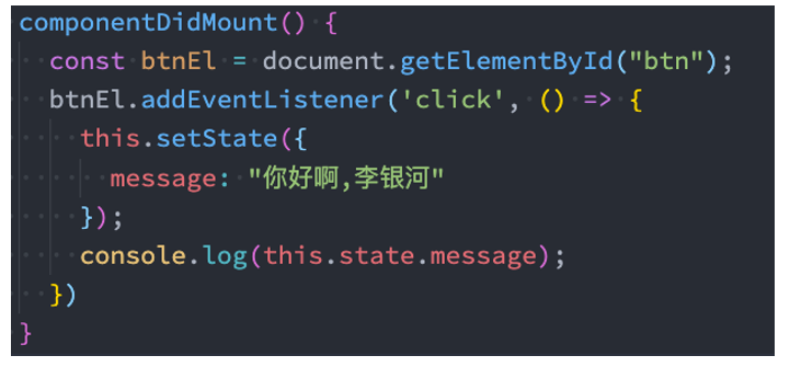 this.setState({ message: "你好啊,李银河" });