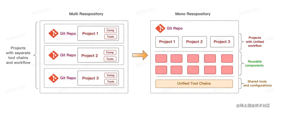 作为一种新的项目管理方式,Monorepo 也可以很好地解决模块复用的问题。在 Monorepo 架构下,多个项目可以放在同一个 Git 仓库中,各个互相依赖的子项目通过软链的方式进行调试,代码复用显得非常方便,如果有依赖的代码变动,那么用到这个依赖的项目当中会立马感知到。