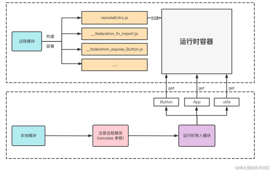 至此,我们就梳理清楚了远程模块的 运行时容器 与本地模块的交互流程,如下图所示